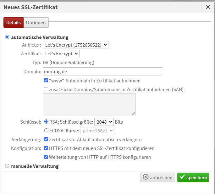 Nur ich glaube, ich stelle mich grade etwas blöd bei der Einrichtung der Zertifikate an. (Für den Server und dem Panel selber).
