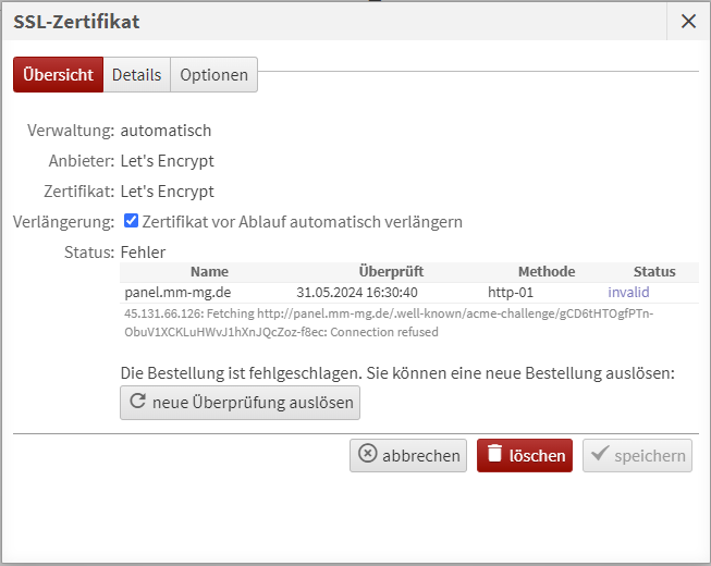 Die LiveConfig Konsole ist über https://meine-domain.de:8443 erreichbar. Ich weiß dass Lets-Encrypt nur Zertifikate für die Standard Domains unterstützt, also ohne Port. Ich hatte das nun auch so umgestellt, dann war es über https://meine-domain.de erreichbar, hier konnte ich dann auch die Zertifikate anfragen, aber der Status ist dann immer in "Pending" geendet und dass keine Connection war.