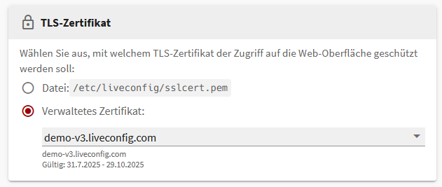 Nach Recherche haben wir festgestellt, dass das Zertifikat für Port 8443 über die Datei /etc/liveconfig/liveconfig.conf gesteuert wird (http_ssl_certificate = /etc/liveconfig/sslcert.pem). Dieses Zertifikat hängt offenbar nicht mit den Zertifikaten zusammen, die im LiveConfig-Backend für die Domains eingerichtet sind.