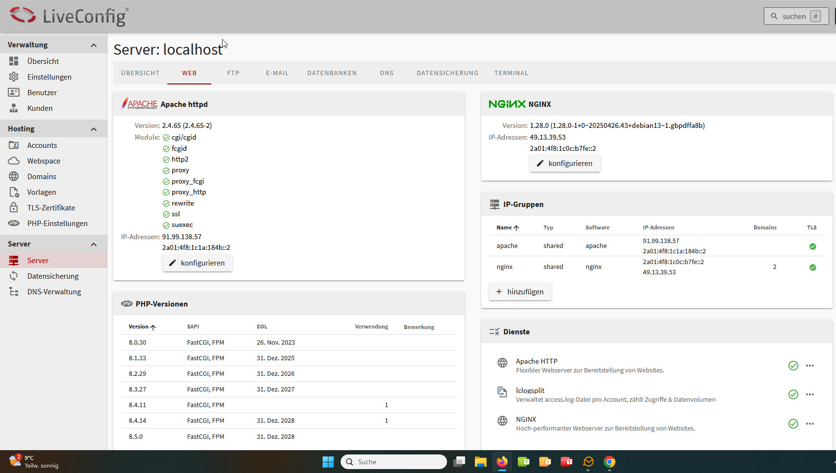 da ich mit der Liveconfig 3 noch so meine liebe Not habe (Webseite kann nicht aufgerufen werden bei Webserver NGINX; auch der Aufruf der dem NGINX zugeordneten IP-Adresse des Servers liefert kein Ergebnis z.B. eine Defaultseite) wollte ich den leeren Debian 13-Server wieder mit Liveconfig 2 bestücken.