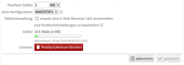 Da diese Dovecot-Option einen Einfluss auf bestehende Postfächer haben kann, ist diese Einstellung bei bestehenden Installationen automatisch deaktiviert, nur bei neuen Installationen ist diese aktiv. Bei einer nachträglichen Aktivierung kann es sein, dass einige E-Mail-Clients einige Ordner dann quasi doppelt haben (z.B. Sent und Sent Messages).