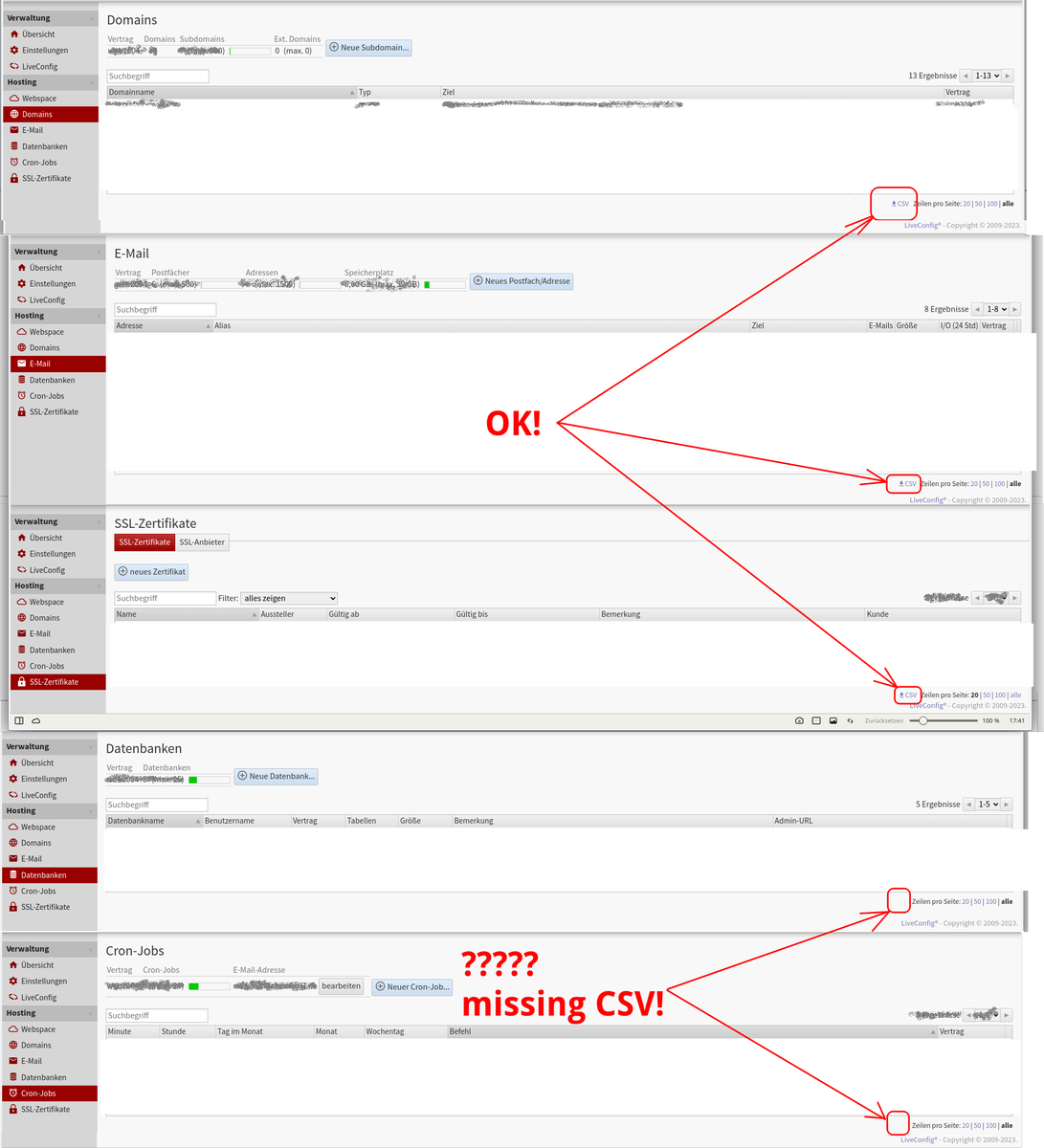 Exportmöglichkeiten in der Übersicht sotel 4. April 2024 Mir würde es helfen, wenn es eine einfache Exportmöglichkeit im CSV-Format fürCron-JobsDatenbanken gäbe. Etwa so wie beiDomainsE-MailSSL-Zertifikate Erleichtert so manche einfache Verwaltungsarbeit!siehe hier:Vielen Dank!