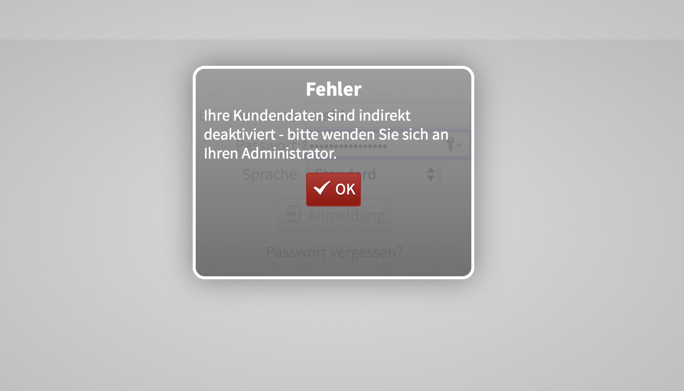 Es erscheint die Fehlermeldung: „Ihre Kundendaten sind indirekt deaktiviert - bitte wenden Sie sich an Ihren Administrator.“